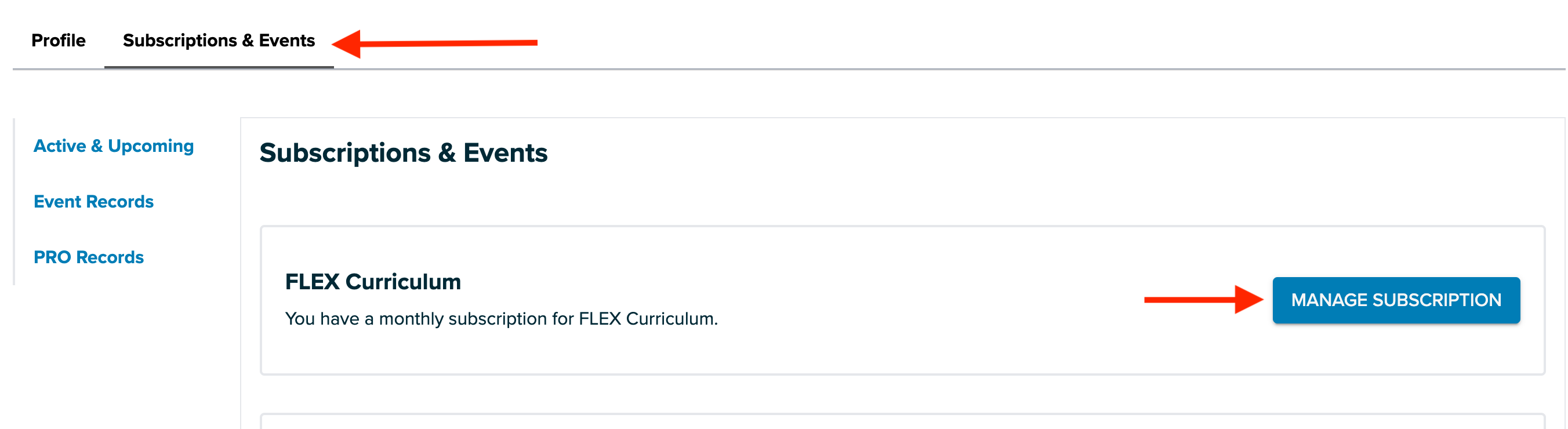 - Navigate to "Subscriptions & Events". You will see the "Manage Subscription" option for any active subscriptions in your account. Click “Manage Subscription” to access the Customer Billing Portal.